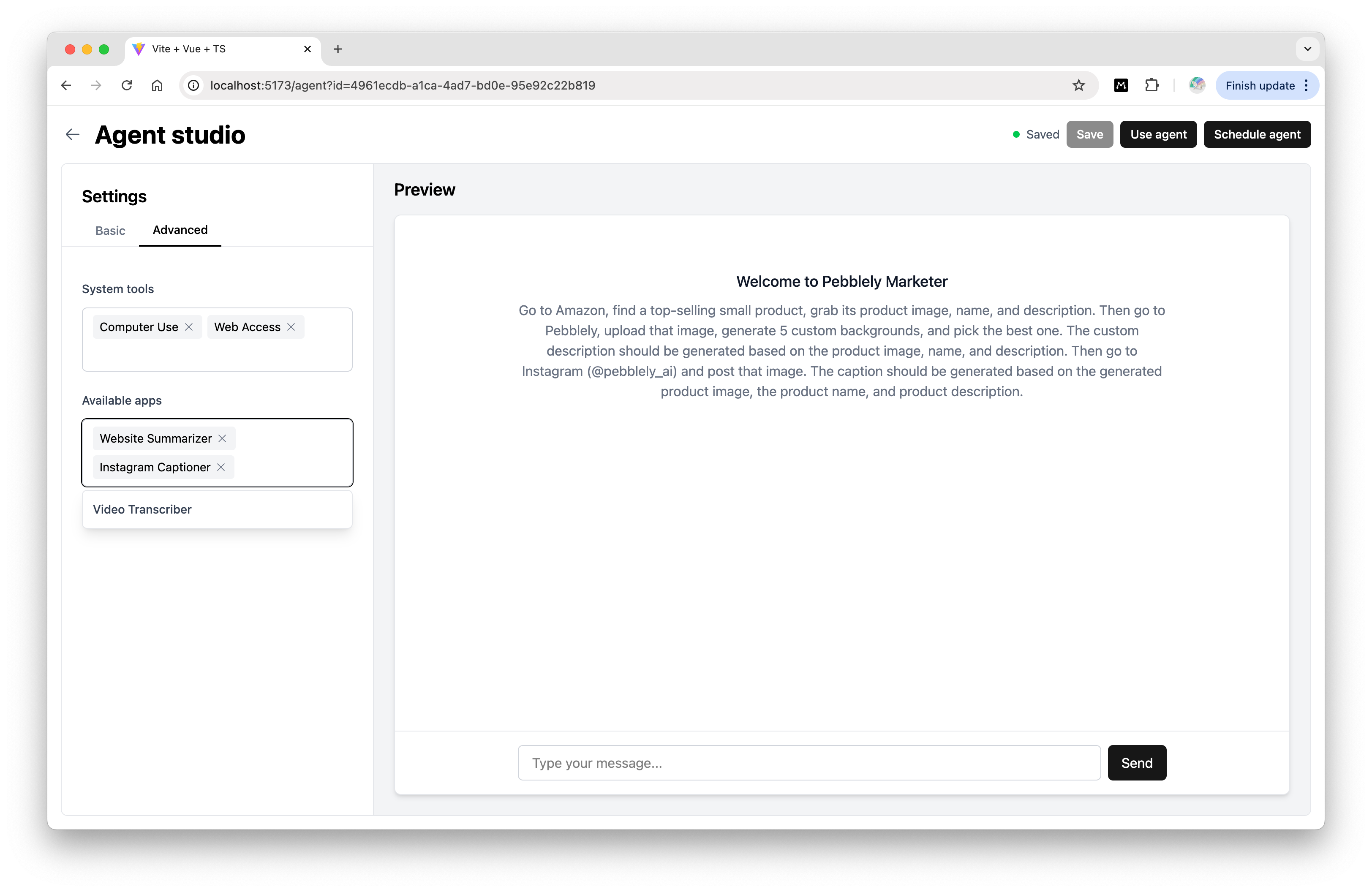 Then, customize the agent by selecting the relevant tools from a list of pre-created tools or your own AI tools. This will allow the agent to do things beyond simply generating text.