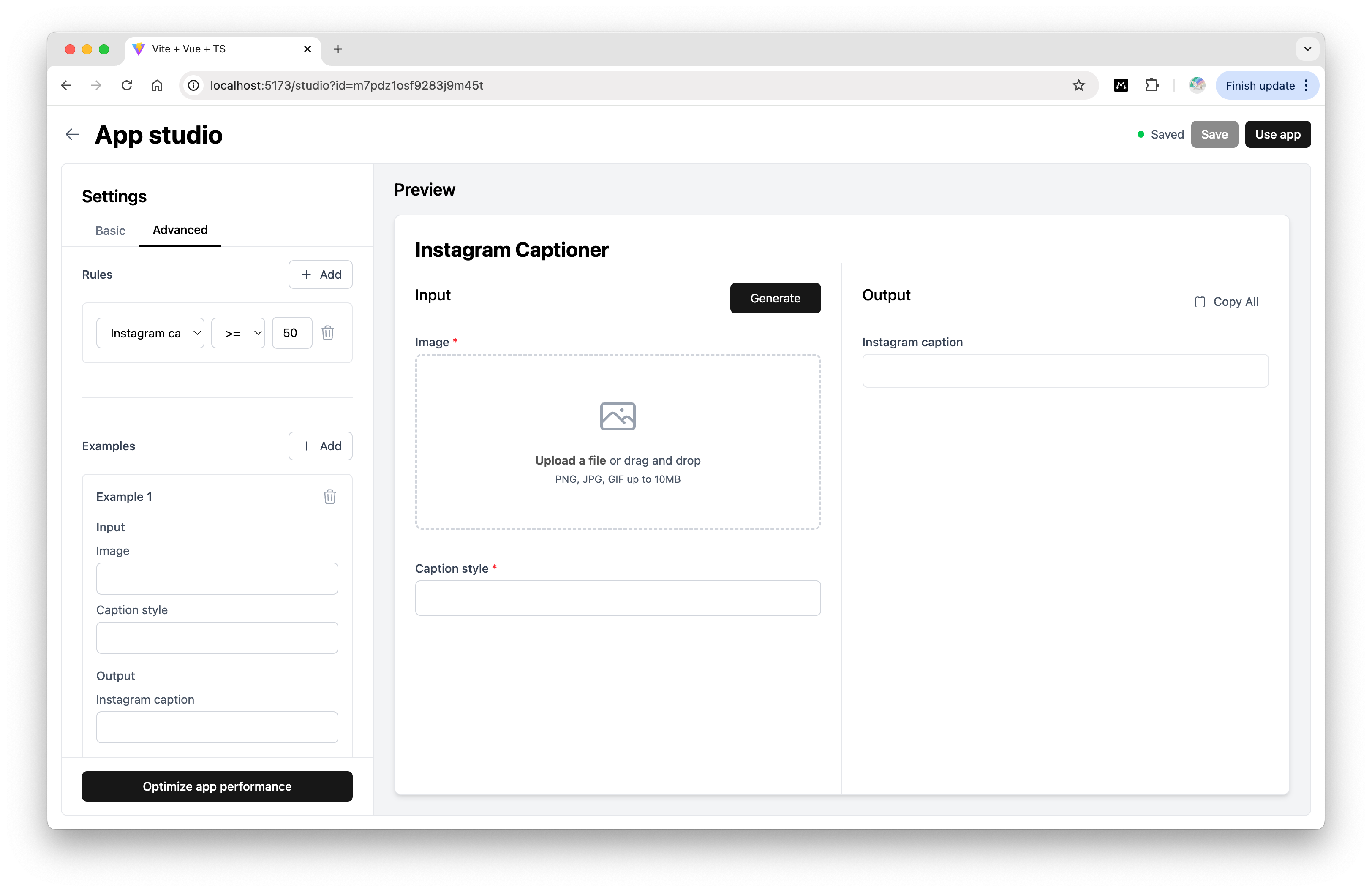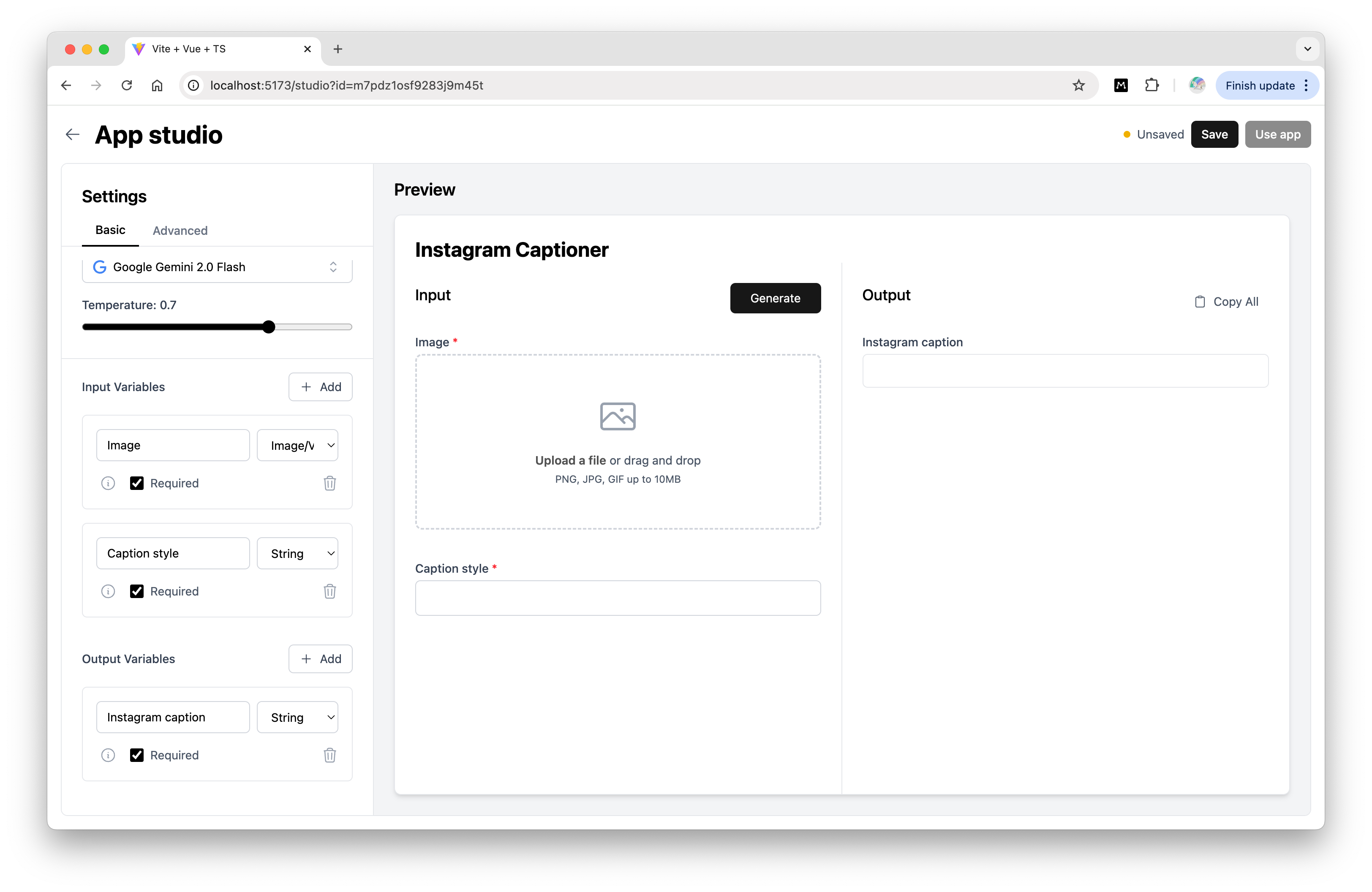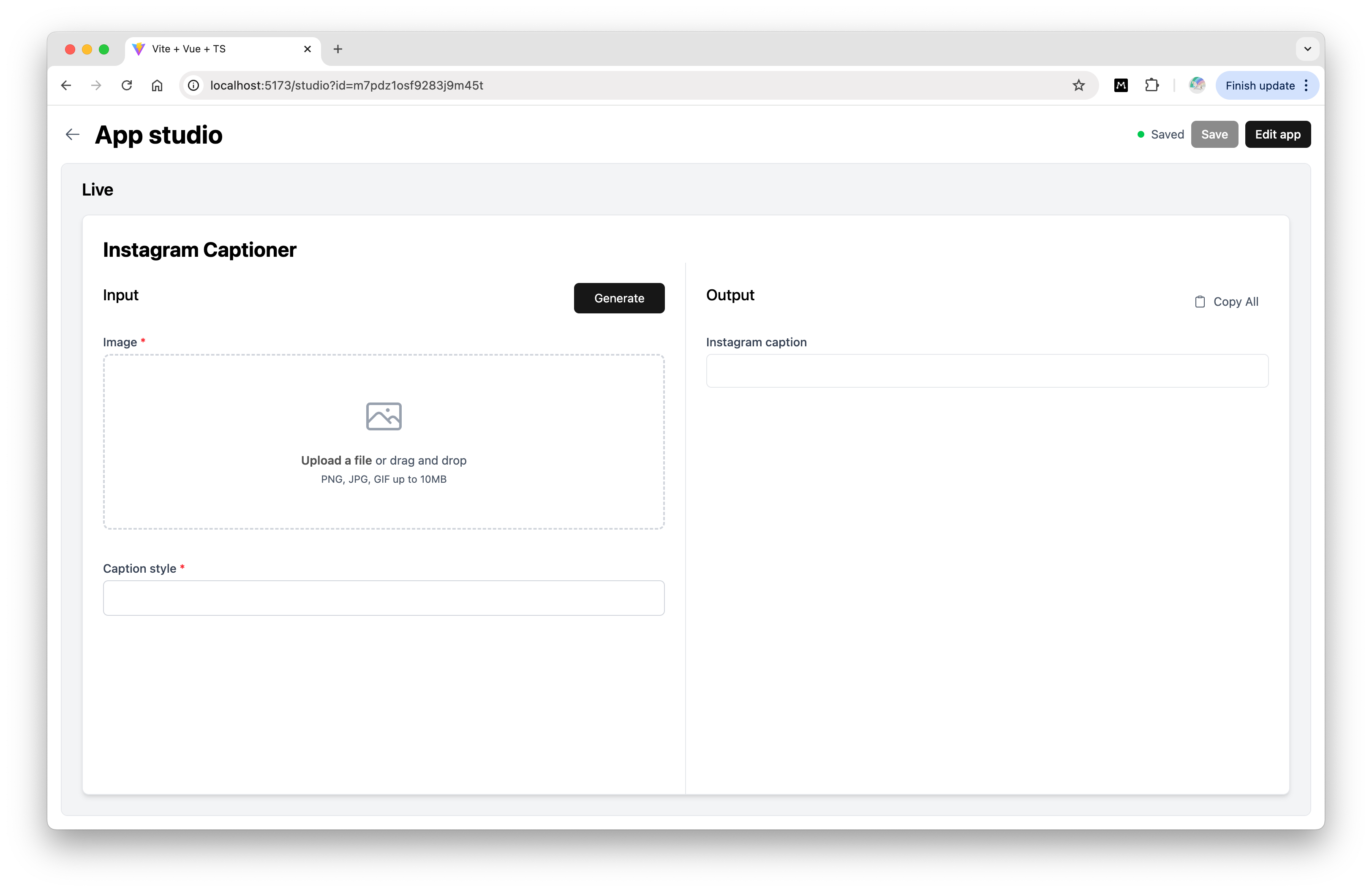 My AI wrapper builder is essentially a form builder. You add your desired fields (inputs) and expected results (outputs) to a form. For the screenshot above, our form takes in an image and a caption style to produce an Instagram caption.